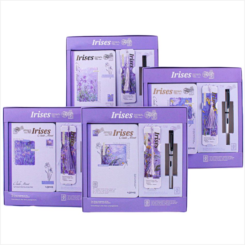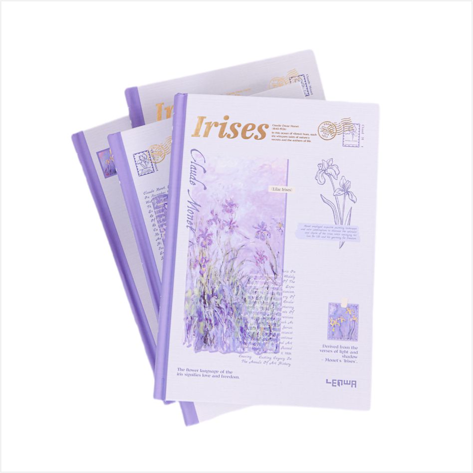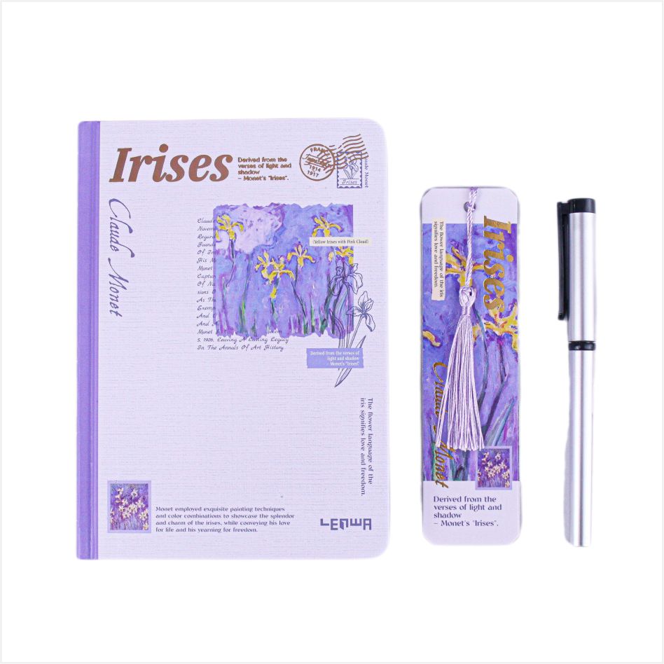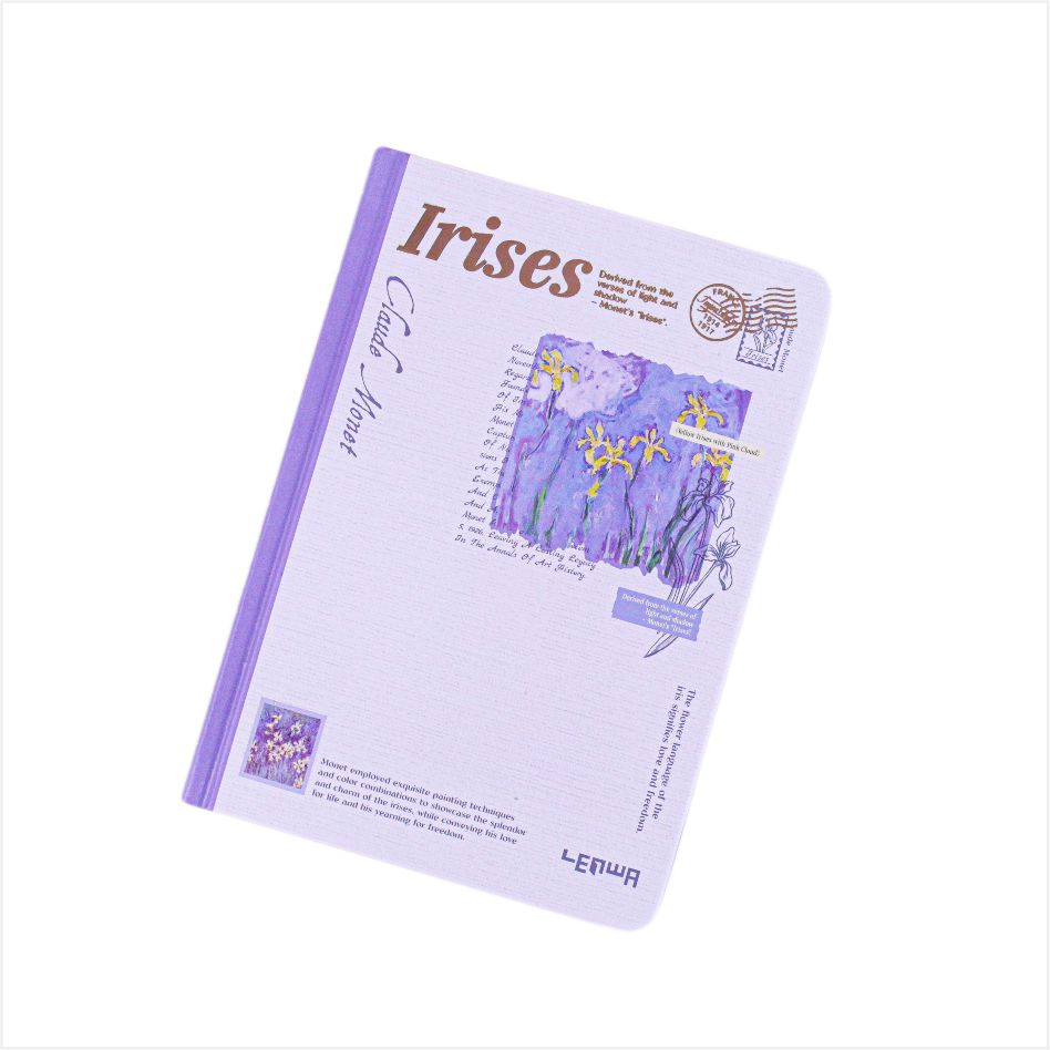 Pomysł na okładkę pochodzi z klasycznego obrazu Moneta Iris, który jest oparty na lilii, łącząc mgliste piękno impresjonistycznego malarstwa z miękką formą tęczówki. Każdy notatnik wydaje się być fragmentem artystycznym zaczerpniętym z ogrodu Monet, z francuskim romansem i naturalnym zainteresowaniem. Po umieszczeniu na Dest jest to elegancka dekoracja; Trzymana w dłoni jest to kolekcja sztuki, dzięki czemu pisanie jest wspaniałym momentem dialogu z mistrzami sztuki.